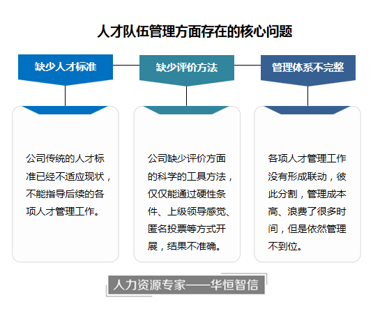 达成合作后,华恒智信的专家项目组深入企业进行了调研,并与各类岗位的优秀人才进行访谈。经过细致了解、总结分析,项目组发现,目前该公司对优秀人才队伍的管理相对粗放,延续了十几年前的管理制度体系,已经不能适应公司的未来发展,主要存在如下问题: