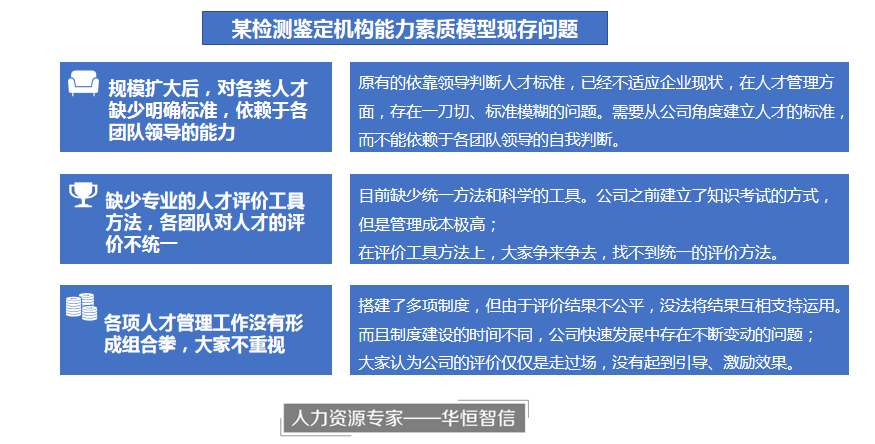 公司在快速发展过程中,提出要在专业方面不断做精做深、在业务方面不断扩展的发展目标。作为检测鉴定机构,人才是核心资源,每一项业务都离不开核心人才的支持,因此新的目标对各个专业领域的人才队伍提出了更高要求。随着业务发展、专业模块更加细化,公司领导逐渐发现内部存在多个问题,包括核心人才流失、顶尖人才不易成长、人才培养效果不佳、管理类人才较少等,直接影响了公司发展。经过内部调研、领导层讨论,大家提出公司需要开展人才盘点、明确人才标准、加大培训力度。这就需要公司明确各序列的专家人才是什么样子,才能指导后续的人才培养。经过内部多方研讨尝试,公司决定邀请外部专业第三方支持建立能力素质模型,一方面,通过建立模型,为长期的人员培养和选拔提供工具,另一方面,对现状人员进行盘点,帮助未来的人才复制和梯队建设。在这种情况下,公司与专业的人力资源专家——华恒智信达成合作,开展能力素质模型的建设工作。