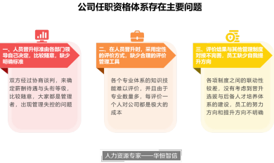 在项目开始后,华恒智信人力资源咨询项目组深入该公司进行了调研,对各级领导干部、技术骨干及职工代表开展了访谈工作,项目组专家经过细致了解、总结分析,发现该公司在任职资格方面存在的主要问题集中在如下几个方面: