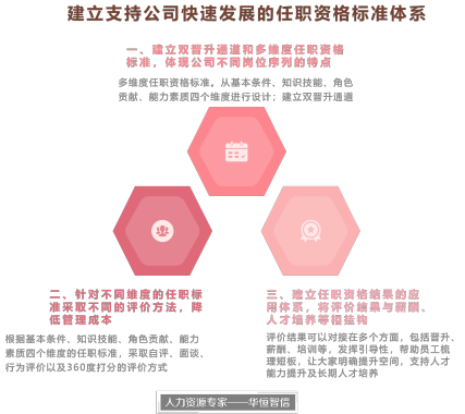 华恒智信专家团队经过分析现状问题,从专业角度提出解决方案,与公司各层领导达成共识,并支持建立了完善的任职资格体系,支持落地。核心的解决方案包括以下三项: