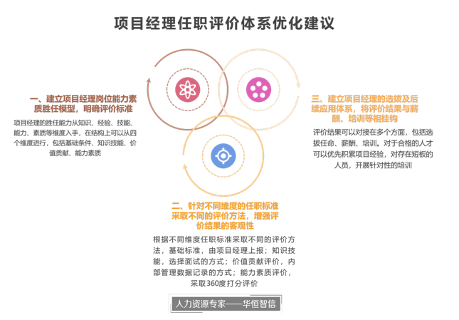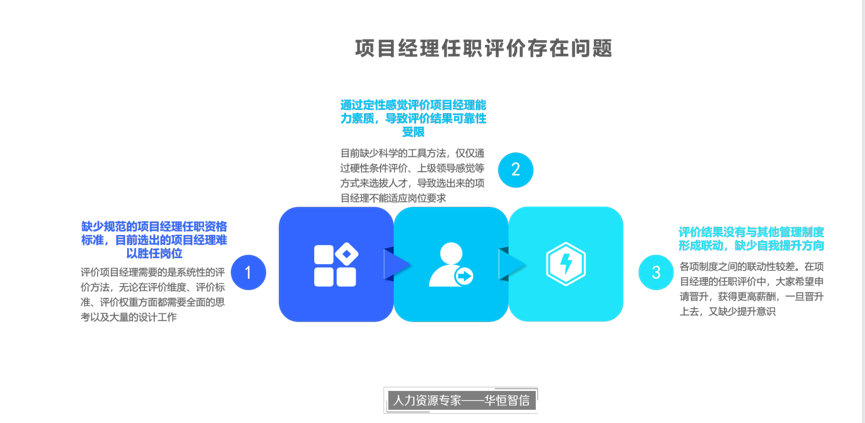 通过调研沟通,项目组发现该企业缺少对项目经理的能力素质分析,在项目经理的任职资格标准制定上不规范,比如企业目前选择项目经理的主要标准为学历情况、专业情况、有技术背景、吃苦耐劳、日常工作积极、工作年限等基本要素,这些因素多数属于基本的任职要求,还是要靠领导的定性评价。但是随着公司项目数量及复杂度的不断增加,对项目经理的要求也不断提高,公司领导不可能认识所有人。公司目前在选择项目经理的标准上,依然只是从基本的任职要求出发,导致选拔出来的项目经理在进入项目工作中,无法胜任岗位,总是出现各种管理问题,影响了项目的进度及质量,华恒智信专家老师指出,评价项目经理需要的是系统性的评价方法,无论在评价维度、评价标准、评价权重方面都需要全面的思考以及大量的设计工作。