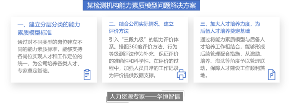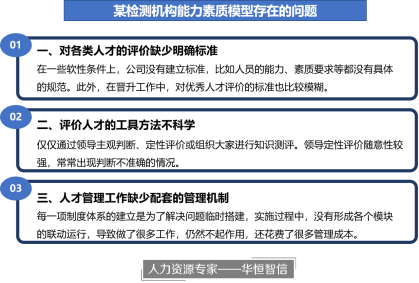 随着公司业务的不断拓展,对项目方面的钻研也更加精细,作为检测行业,每项业务都离不开专业人才的支持,因此公司对人才队伍建设方面提出了更高要求。在实际管理中,公司领导层发现对人才能力的评价比较困难,人才培养效果不明显、人员成长进步速度慢、核心人才流失等问题,进而阻碍了公司发展。经过公司领导层讨论,决定对现有人员进行盘点,建立人才标准,为后续人才招聘、晋升、培养奠定基础,经过公司多次尝试,发现评价人才投入的时间、人力成本过高,而且没有实际效果。在这种情况下,公司决定邀请外部专业第三方——华恒智信建立合作关系,支持公司建立能力素质模型,为未来的人才管理工作做好基础建设。