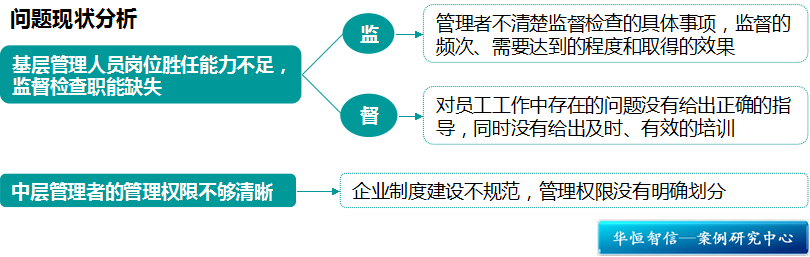 同时,该企业中层管理者的权限没有明确划分清楚,这主要是企业制度建设不规范造成的,各管理人员对自己的管理权限没有明确划分,这种现象容易导致企业中出现产生问题时互相推诿、互不承担责任的问题,进而导致管理者监督检查职能缺失的问题。