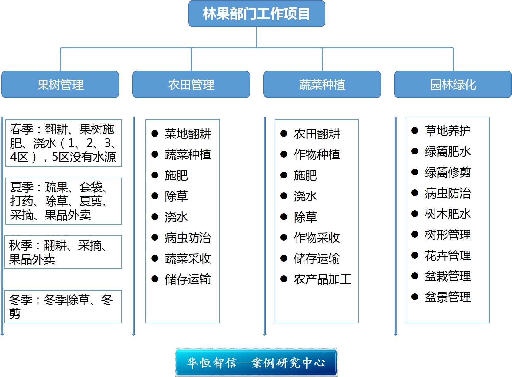 在进行定岗定编过程中,第一步需要做的就是对林果部工作项目的梳理分析,明确部门工作内容,是进行人员配置安排的前提,因为根据工作内容的不同,其需要的人员数量自然也是不同的。具体内容详见下图: