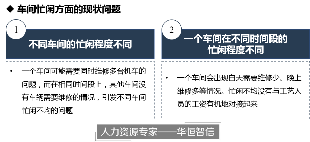 A公司是一家以机车修理为主、零部件制造为辅的大型国有企业,占地约300多万平方米,现有职工7000余人,其中专业技术人员2200余人,中高级职称约800余人。公司致力于大型铁路工程机械制造业务的发展,具备年检修1000台机车的能力,检修产品包括内燃机车、电力机车等国内主要机型。同时,公司也具备了机车关键部件的制造能力,是目前国内检修机车品种最多、客户分布最广的专业化机车修理和装备制造企业。在快速发展的过程中,该企业面临着由于政策调整带来的工作量忙闲不均,直接导致了不同时间段、不同部门的忙闲不合理,业务量大的时候,人员忙不过来,都要求加人,不加人导致业务完不成、产量质量都受到影响;业务量小的时候,人员都有富裕,加上企业没有退出机制,长此以往,人工成本大幅度提高。这种情况下,该企业与华恒智信达成合作,希望通过定岗定编项目梳理工作量,盘点人才,解决相应的问题。
