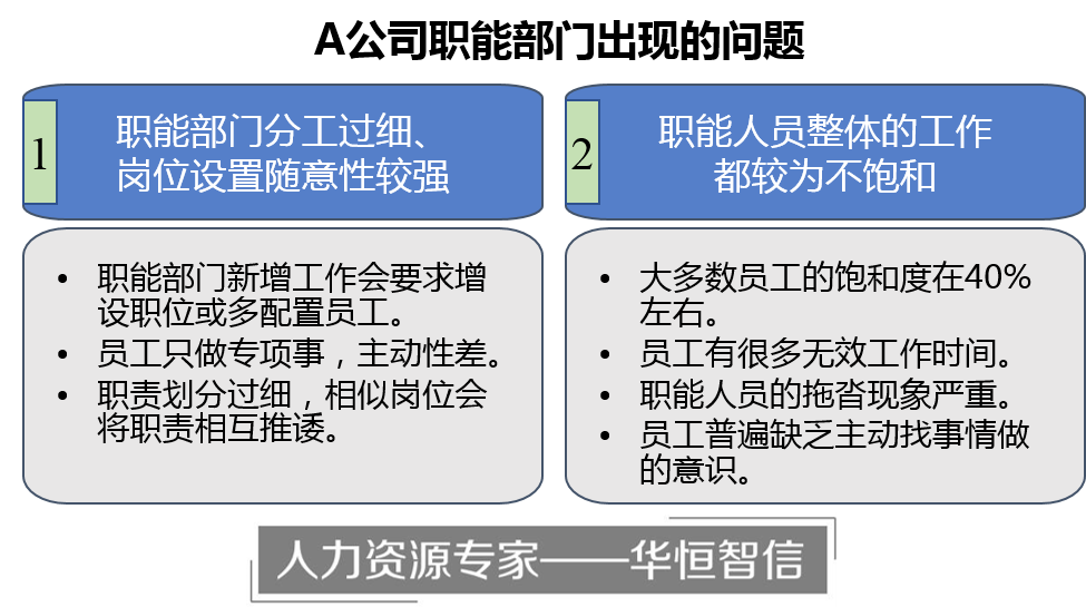在业务发展的同时,企业遇到了外部市场环境与上级政策调整带来的双重压力,为了保障生产,降低整体成本,对职能部门的职能发挥提出更高要求,作为老牌国企,历史原因导致有不少职能部门员工处于闲散状态,提高了人工成本。企业希望通过与华恒智信合作,对职能部门进行定岗定编,解决相关问题。经过分析发现,目前主要存在以下问题: