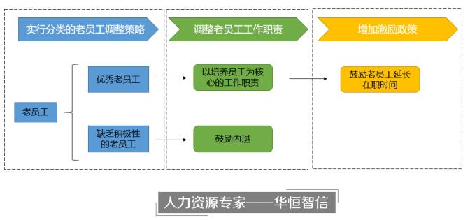 (1)实行分类的老员工岗位整策略。老员工具有丰富的岗位工作能力与经验,同时因为公司现阶段存在老员工工作积极性,学习主动性的差异,项目组建议公司根据老员工的近几年工作态度、工作业绩、工作贡献等因素,根据最终定岗定编方案的缩编标准,额外保留一部分优秀老员工用以培养新员工,实现部分老员工分流,部分留存培养新人的分类调整策略。
