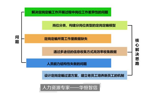 为解决以上核心问题,公司与华恒智信顾问专家团队达成合作,希望通过定岗定编项目,梳理各类岗位的工作饱和度,明确各类岗位的切实工作量并明确岗位编制,以达到精简现有编制,解决冗员问题的目的,并在编制明确,引进合适数量的新人后,通过搭建新员工能力提升机制,解决人员结构性失衡的问题,强化公司未来的人力资源队伍。