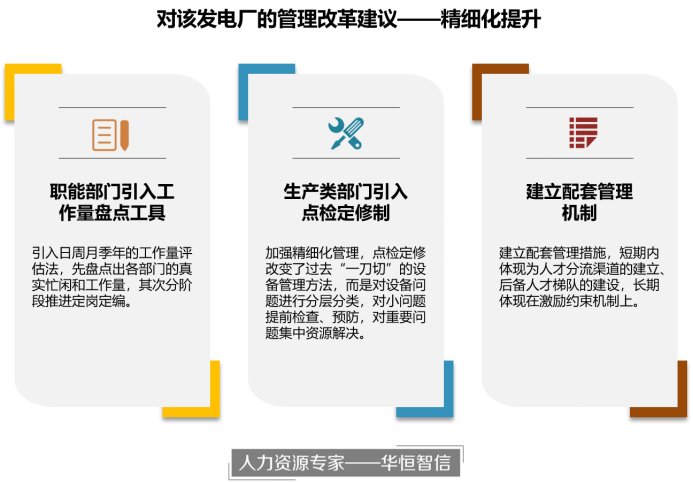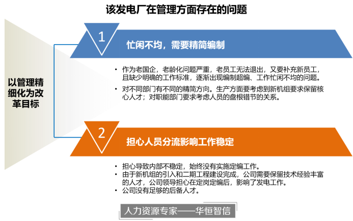 公司发展至今,凭借着机组更新、优秀的企业经营理念,迅速跃居至国内同行业领先梯队。但随着时间推移,特别是在引入了新的先进机组后,在内部管理方面,暴露出人员工作素质能力不强、工作积极性不高、工作标准不清楚、老龄化严重、人员忙闲不均等问题。作为老国企,追求稳定为主,不愿意轻易淘汰不胜任人员,又受制于编制和薪酬总额限定,无法引入新鲜血液。导致新的机组建设后,没有发挥出应有效能。为解决以上核心问题,公司与华恒智信顾问专家团队达成合作,希望通过一系列管理精细化改革项目,提高管理水平、精简编制、解决冗员问题,并逐步引进合适数量的新人,搭建新员工能力提升机制,解决人员结构性失衡的问题,强化公司未来的人力资源队伍。