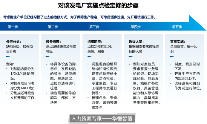 (4)在此基础上,项目组建议引入点检定修制,重新梳理各层级的职责边界。点检定修制是通过对设备按照规定的检查周期和方法进行预防性检查(点检),取得设备状态信息,制订有效的维修策略,把维修工作做到设备发生事故之前,使设备始终处于受控制状态的管理方式。