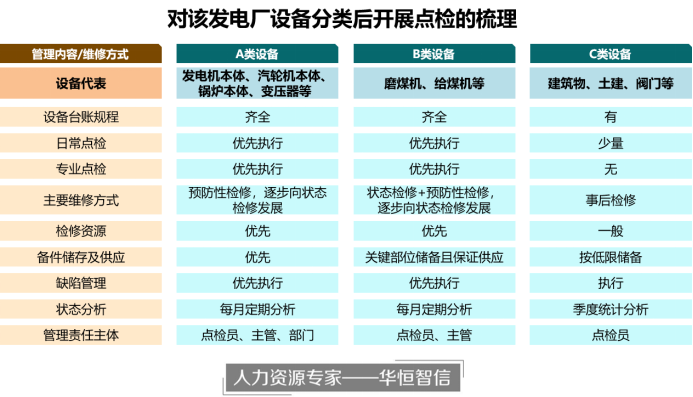 虽然点检定修制是一种设备管理方式,但是在管理思想上是想通的,即通过对管理对象的分层分类,针对性提供不同的管理方法、调动不同的资源来解决问题。在实际工作中,这样的精细化管理思想,可以借鉴在各类管理活动中,例如人才管理、职责划分、项目管理等。华恒智信专家组在长期开展咨询培训的过程中,经过扎实的理论研究、实践经验,建立了“PCMM评价体系”“三级五角色”“日周月季年”等工具模型,都反映出精细化管理的思想,解决了各个领域的难题,多次获得客户的高度认可。