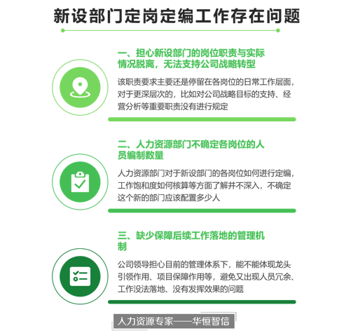 华恒智信人力资源咨询团队抵达现场后,与公司的高层干部、部门主任和员工代表开展了细致的访谈和沟通,了解公司对新设部门的期望与要求,通过分析发现公司在对新设部门的定岗定编工作上存在以下问题: