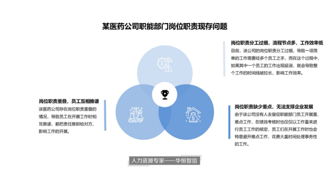 在双方达成合作后,华恒智信的专家老师们深入该医药公司职能部门进行了现场调研,与各级领导以及基层员工进行了充分沟通。经过总结分析,发现该医药公司职能部门在岗位设定方面存在一定的问题,主要问题如下: