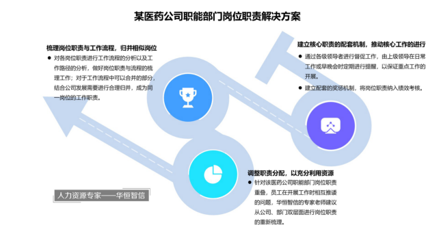 为解决该医药公司岗位职责分工过细,流程节点多,工作效率低的问题,华恒智信专家老师结合长期管理经验,建议对各岗位职责进行工作流程的分析以及工作路径的分析,做好岗位职责与流程的梳理工作;对于工作流程中可以合并的部分,结合公司发展需要进行合理归并,成为同一岗位的工作职责;例如,上文提到的宣传工作,文章撰写、配图制作与排版可以合并,由一个岗位负责,根据工作量配置人数,提高工作效率。明确各类岗位职责要求,进而帮助企业提高运作运营 ,实现工作效率最大化。