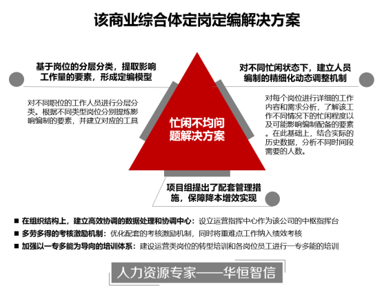该公司目前的管理团队是从建设团队转型而来,在转型过程中,公司面临着人员能力素质不匹配、前期投入成本大、贷款压力大等挑战,需要控制成本、快速提升效益。与此同时,下属各个部门向上级提出了多次增加人员配置的要求,然而上级不清楚增加编制的依据,为了控制成本,始终没有加人。同时,该商业综合体面临着忙闲不均的问题,在淡旺季的人流量差异较大,导致了“忙时员工人手不够,闲时员工无所事事”的不平衡现状。在此背景下,领导希望通过专业的人力资源专家——华恒智信,通过对该公司的定岗定编,建立工具模型,精确配置人力资源,降本增效,提高运营效益。