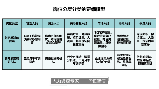 为建立合理确定工作量及人员编制的工具方法,华恒智信的专家老师建议对不同岗位进行分层分类,根据不同类型岗位分别提炼影响编制的要素,并建立对应的定编工具。