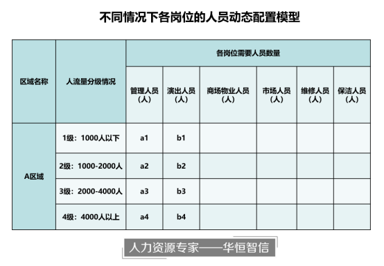 由于商业综合体的固有属性,其工作量受到淡旺季、人流量、游客特点等多种因素的影响,而不同区域和时间的人流量不同,也就导致了公司需要的人数不同。当旅游高峰期时人流量大,需要的各岗位员工也多;当淡季时人流量小,需要的员工也较少,人员应该如何调配更加合理?华恒智信的专家老师通过深入调研发现,目前该商场的人员配置相对固定,并没有基于人流量的影响因素进行相应临时性调整,也没有规范的核算工具,导致忙时顾不过来,闲时没有高效安排。