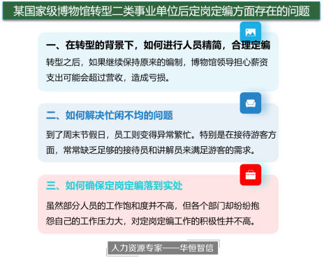 某国家级博物馆是由当地政府与自然资源局共建共管的事业单位,是一家综合性较强的博物馆,入选过全国热搜博物馆百强榜单。建立时,该博物馆属于公益一类事业单位,近两年,随着上级政策的改变,该单位由一类单位转向二类单位,有了一定的经营压力,需要进行降本增效。在自我经营中,和其他博物馆一样,该单位也遇到了忙闲不均、人力成本上升等问题。在此背景下,该单位领导想要以定岗定编为突破口,优化人员配置,提高工作效率。但是在改革的过程中遇到了一些问题,比如到底应该如何定编、博物馆工作日人员比较清闲,周末比较忙,如何通过定岗定编解决忙闲不均的问题等。针对这些问题,该博物馆领导希望通过专业的人力资源专家——华恒智信,帮助博物馆完成定岗定编优化工作,建立工具模型,精确配置人力资源,降本增效,提高运营效益。