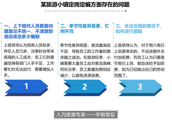 然而,随着小镇的不断发展壮大,管理机制上也面临着挑战。其中,人员管理是当务之急。由于文旅行业季节性差异显著,人员的忙闲不均导致了管理上的困难。领导层和基层之间存在着关于人员规模和工时、加班费用等问题的分歧,这进一步加剧了管理的复杂性。领导认为在旅游淡季时人员冗余,人力成本高,希望精简人员,而基层干部员工认为虽然在旅游淡季时客流量减少,但是在旅游旺季时会有明显的人手不足情况,需要招募更多人员。此外,关于大家长期加班如何补偿加班费的争议也日益突显。针对这些问题,公司领导意识到需要专业的人力资源管理来解决管理难题。经过集体决定,他们寻求了人力资源专家——华恒智信的帮助。华恒智信通过定岗定编工作改进,建立工具模型,精确配置人力资源,降本增效,提高管理效率。