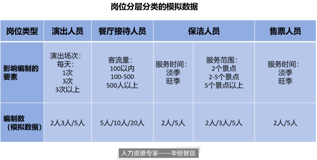 对目前的岗位进行分层分类。根据不同岗位的性质和职责,将其划分为不同的类别,如管理人员、表演人员、餐厅接待人员、售票人员、小镇保洁人员等。通过分类,可以更清晰地了解各类岗位的特点和需求。之后,对各类岗位提炼影响编制的要素。针对不同类别的岗位,提出影响工作量的要素,如工作忙闲度、演出场次、接待游客数量、打扫面积等。这些要素可以帮助评估每个岗位的工作量和重要性,为确定合理的编制数提供参考依据。