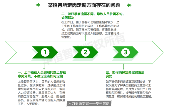 在最近几年,受到疫情后的经济形势影响,该招待所业绩出现下滑、宾客数量骤减,迫使招待所必须主动追求新的经营模式,改变过去的粗疏的管理。在此情况下,随着文旅行业的蓬勃发展,上级单位为该招待所确立了新的使命与定位:实现降本增效,提高服务水平,提升运营能力。由于文旅行业季节性差异显著,旅游宾客数量的变动明显,内部人员的忙闲不均导致了管理困难。领导层和基层之间存在着关于人员数量规模问题的分歧,这进一步加剧了管理的复杂性。领导认为在旅游淡季时人员冗余,人力成本高,希望精简人员,而基层员工认为虽然在旅游淡季时客流量减少,但是在旅游旺季时会有明显的人手不足情况,需要招募更多人员。此外,领导还特别关注如何制定合理的定岗定编,以确保员工能够更好地接受并减少排斥感,如何确保定岗定编的实施能够真正落到实处。经过集体决定,他们寻求了人力资源专家——华恒智信的帮助。华恒智信通过定岗定编顺利实现改革,建立工具模型,精确配置人力资源,降本增效,提高管理效率。