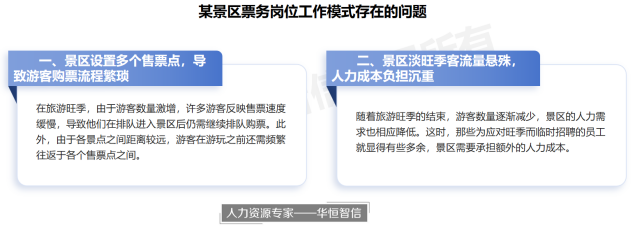 然而,旅游行业的一个显著特点是其季节性差异极大。在旅游旺季,尽管景区通过分设多个票务处来分散票务人员的工作压力,但由于游客数量庞大,仍有很多游客反映售票速度缓慢,排队时间过长。而到了旅游淡季,随着游客数量的减少,这些分散的票务处则可能面临人员冗余的问题,造成景区不必要的人力成本浪费。面对这一挑战,景区管理者不得不深入思考:如何对景区票务进行更加高效、合理的管理,既能确保旺季时游客能够快速购票、享受顺畅的旅游体验,又能在淡季时灵活调整人员配置,避免资源的过度浪费?经过景区管理层商讨后决定,邀请业内领先的人力资源专家——华恒智信的帮助。希望借助专业第三方的智慧和经验,对景区内部票务岗位的工作模式进行管理提升,通过合理的改革建议,实现景区票务既在实现有效的人员配置的同时,又能够满足游客需要。