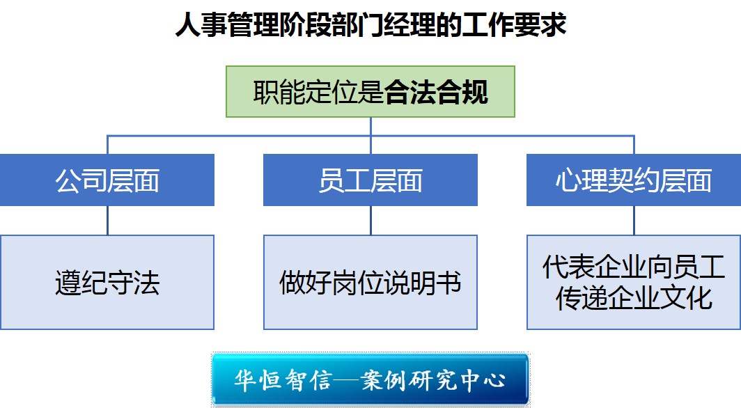 在人事管理阶段,部门经理的职能定位是合法合规。具体而言,部门经理的职能体现在三个方面:公司层面、员工层面、心理契约层面。