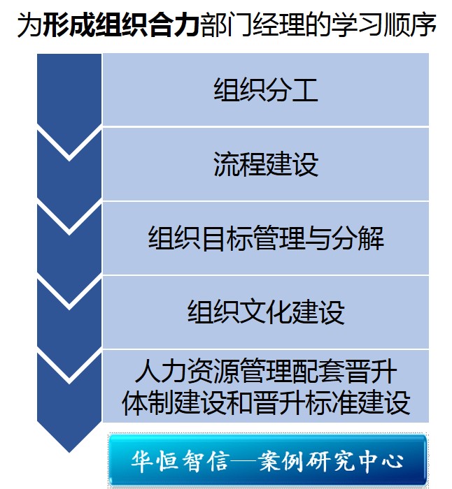 如何形成组织合力?华恒智信咨询专家认为,部门经理应首先学习组织分工,做到各岗位人员权责分明,没有互相重叠和互相牵扯,这是提高企业工作效率的基础和前提;第二,在组织分工的基础上,部门经理应学会流程建设,明确各项工作的经营流程、业务流程和管理流程,从而有效整合资源,促进部门间和员工之间的信息沟通,提高组织效率;第三,学习组织目标管理与分解,将总体目标在纵向、横向或时序上分解到各层次、各具体员工,明确各员工的目标责任;第四,学习组织文化建设,通过制定员工行为规范,开展文化宣传活动,向员工灌输组织文化思想,建设符合企业特征的组织文化;第五,学习人力资源管理配套晋升体制建设和晋升标准建设, 为员工的能力提升和职业晋升提供参考标准。最后,部门经理学习人才培养开发机制建设, 通过员工培训需求分析,培训计划拟定,培训过程监控,培训效果评估,员工入职培训(入职同化),员工在岗培训,培训资源管理以及培训师的选择与管理,培训教材的设计与使用管理等多方面建立和完善人才开发和培养机制。