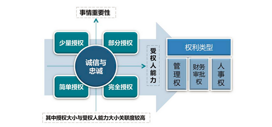 华恒智信结合优秀企业的管理特点,设计出具有自主知识产权的四级授权量表(或七级授权量表)。分别是:完全授权、部分授权、少量授权和简单授权(见上图)。同时将权利类型归纳为三个大方面:管理权、财务审批权、人事权利。三个权利类型下面分别有18项小的各类权利,并针对企业的不同来选择使用。授权是企业管理干部职业能力的一项重要指标,也是企业管理效率提高的客观保障,授权也等于责任授予,因此企业管理干部对不同的事情授权多少,如何授权,授权给谁都需要企业自身不断摸索和提高的。