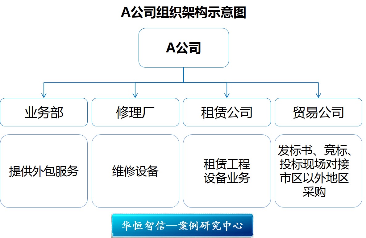 A公司主要从事维修服务、配件销售等业务,下设有一家小型租赁分公司,从事工程机械的租赁业务。按照业务类型,公司可以分为四个部门,项目部、修理厂(大修厂)、贸易公司和租赁公司。项目部是针对于钢铁厂的一些外包服务而设立,服务于数家钢铁厂。贸易公司的业务主要分为两方面,一是为公司发标书、竞标以及与投标现场对接,二是在市区以及外地进行采购。租赁公司主要从事租赁工程设备方面的业务,负责提供设备和操作手。