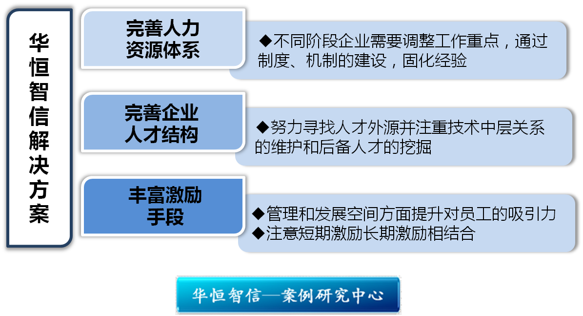 针对A公司人力资源体系缺失、技术中层短缺、员工流失率高的问题,华恒智信顾问专家团队认为可以从以下几个方面入手来解决问题: