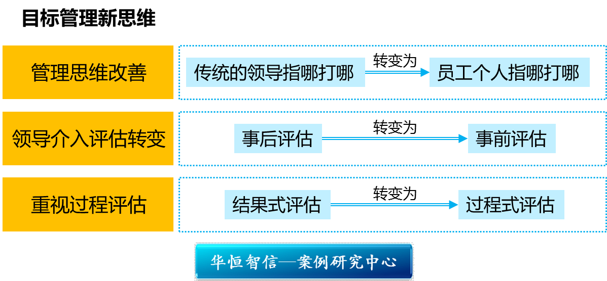 德鲁克认说过“企业的使命和任务,必须转化为目标。如果一个领域没有目标,这个领域的工作必然被忽视。”然而,企业实施目标管理,要突破传统的思维,体现民主性、参与性,同时重视反馈的及时性和对过程的控制。例如,从领导指派向员工个人承诺的转变,从领导事后介入向事前介入的转变以及从结果评估向过程评估的转变。需要注意的是,企业除了要转变目标管理思维之外,还要落实好各项具体到工作,包括选拔合格的能够准确分解目标的业务人员,制定事前评估、过程评估的程序和步骤等,以及建立上下沟通的畅通渠道等。只有落实各项配套的制度、程序、规范,新思维下的目标管理才能顺利实现。
