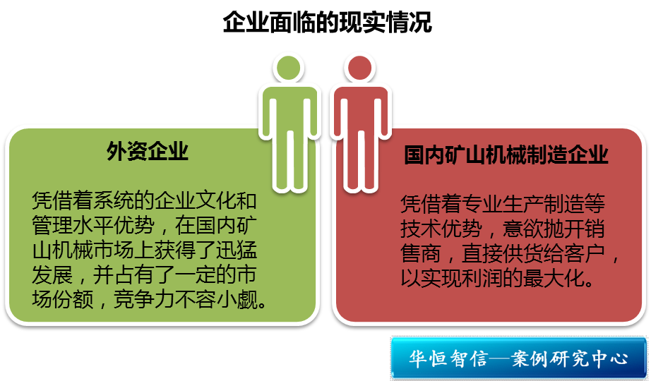 A公司扩大销售人员规模,其主要意图是通过加强部署市场力量,以在矿山机械市场上占有更大的市场份额。而企业面临的现实情况是,一方面,看到中国矿山机械市场的巨大需求,外资企业纷纷染指,意欲分得矿山机械市场的一杯羹。外资企业凭借着系统的企业文化和远远优于国内企业的管理水平优势,在国内矿山机械市场上获得了迅猛发展,并占有了一定的市场份额,其竞争力不容小觑;另一方面,国内的矿山机械制造企业也不甘心将大部分利润让给A公司这种销售企业,他们凭借着专业生产制造等技术优势,也意欲抛开销售商,直接供货给客户,以实现利润的最大化,所以他们纷纷加强终端销售市场的建设,这对A公司将会是致命的打击。由此,我们不难发现,不断扩大的市场需求,使得市场竞争形势变得激烈起来。A公司,作为一家专业矿山机械销售企业,其面临的来自外资企业和上游生产商的双重竞争压力,使其稳固并扩大市场的愿望变得严峻起来。