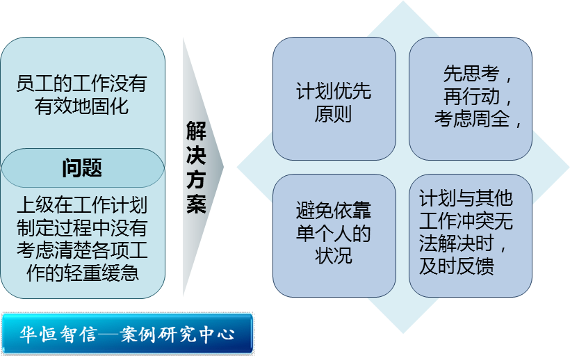 对于上述问题,究其根源,华恒智信咨询师团队分析认为:问题主要是在于员工的工作没有有效地固化,总是在等待上级领导安排工作才可以将工作进行下去;上级在工作计划制定过程中,没有清晰地考虑清楚各项工作的轻重缓急,没有合理有效地将工作分解下去。