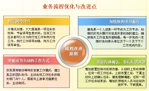 固化并优化设计中心业务流程是华恒智信顾问团队与中心领导确认需要解决的首要问题。针对该中心工作流程中存在的问题,华恒智信顾问建议,基于对部门职责和影响组织绩效的重要工作梳理,借由华恒智信专业的流程设计思路与工具,针对不同的流程进行流程的固化、设计与优化,总结提炼重要经验点与关键控制点,为中心工作人员提高工作效率和工作质量,规范内部管理,梳理和建立一套基础的业务操作标准。通过对企业现状问题的剖析与科学设计四项,提炼出流程改进优化设计思路的四项基本原则: