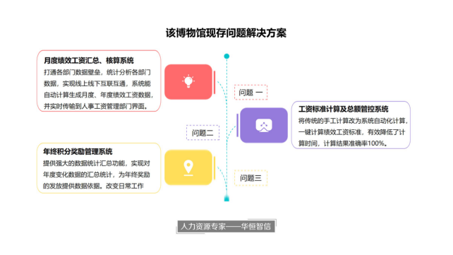 在对该博物馆的现状问题有了初步了解后,华恒智信的专家老师提出了多个解决思路,经过多层次分析后,最终建议在完善目前薪酬体系基础上,引入工资管理信息系统是解决该博物馆现存问题的最优方案。该系统主要包含3个子系统,分别是:绩效工资标准计算系统、月度绩效工资核算系统和年终积分奖励管理系统,可有效解决公司现存问题。