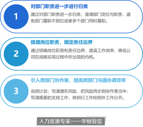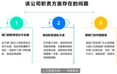 随着公司的不断发展,在管理方面出现了一些问题,这些问题随着时间的推移,不断放大,已经影响到了公司的工作效率和发展,比如各部门之间存在推诿扯皮的现象,大家不清楚工作具体应该由哪个部门去开展;岗位职责混乱不清,出现交叉、重叠、遗漏等问题;部门之间的协作程度比较低。为了统一规范,奠定管理基础,该公司希望寻求专业第三方的帮助,对公司内部的职责进行优化,明确各个部门、岗位的职责,并希望部门与部门之间能够形成良好的协作关系。在这种情况下,公司与专业的人力资源咨询公司——华恒智信达成合作,开展职责优化的设计工作。