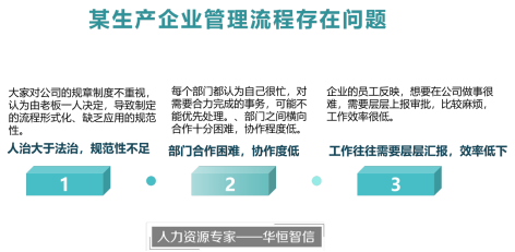 近几年随着企业的不断发展、人数增加,以往“重经营轻管理”的管理方式逐渐暴露出一些问题,大家都感觉到企业出现了“大企业病”,虽然是民营企业,却感觉到效率低下、流程繁琐。比如,在企业中虽然有具体工作流程,但是往往是老板一句话,就脱离了流程规定,与制度性的规范脱节;部门之间协作程度不高,需要多个部门一起协作时,往往需要多次催促或者领导施压,才能完成;在公司想办一件简单的事情都需要层层审批上报,效率很低……这些问题对企业整体工作效率的提高有着很大的阻碍影响,也令企业领导很头疼。经过企业高层领导商讨,决定与人力资源管理咨询专家——华恒智信展开合作,帮助企业改变现状,脱离因为流程问题给企业带来效率降低的桎梏。