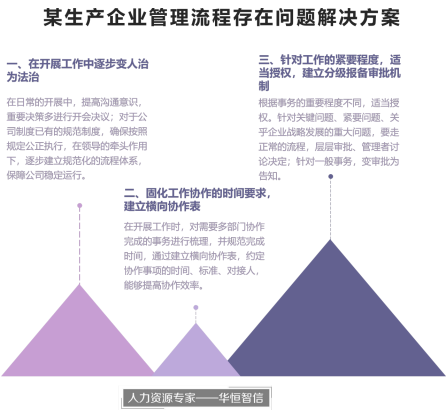 流程管理,是保证工作效率提高的关键;只有将流程中的各个节点把握好,才可以将工作做的更顺畅,让人员的效率迅速提高。在本案例中,该企业由于管理流程不合理,引发一些问题,比如,实际工作与制定的规范脱节,导致人治大于法治;横向协作困难,大部分依靠人和人之间的关系,关系熟悉就乐于帮忙,不熟悉就不断推迟进展;纵向节点过多,导致处理一件简单的事情需要层层审批上报,效率极低。针对这些问题,华恒智信建议:加强沟通意识,确保按照公司已有制度执行工作;建立横向协作表,把握工作完成时间;根据事务的轻重缓急,进行分类处理。