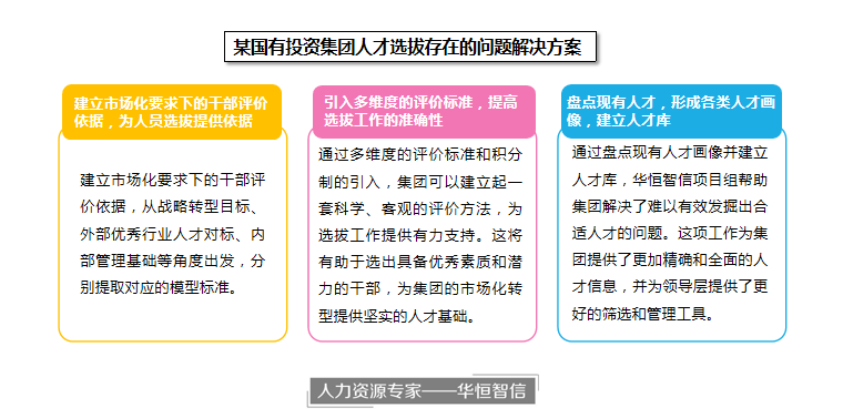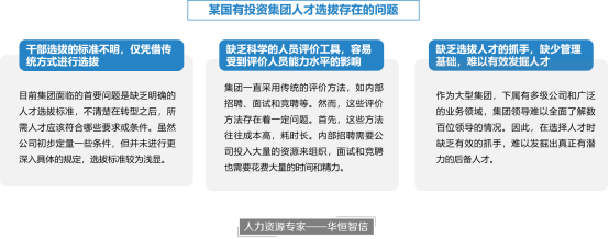 某国有投资控股集团是经南方某省人民政府批准,于2006年注册成立的大型国有资本投资运营公司,拥有全资、控股公司几十家。近年来,随着市场环境和企业的不断发展,该集团开展了市场化转型,从城市投资建设、工程项目建设,转型为市场化的创新性投资平台。这种转型不仅要求集团调整经营模式和战略规划,还对人员的市场化素养提出了更高的要求。集团在转型的过程中发现自身缺乏相应的投资人才、经营人才、市场开拓人才等。面对当前困境,集团领导感到选拔人才时缺少依据,无从下手。由于该集团是一个具有下属公司众多、涉及多个业务领域的大型集团,其领导层无法全面了解每个下属公司的干部人才。因此,在选出适应转型发展的人才方面,集团领导只能通过个人印象、私下询问来发掘人才。为了解决这一问题,该集团领导决定寻求专业的人力资源团队的帮助。于是,他们邀请了人力资源专家——华恒智信来协助集团解决人才盘点的问题。