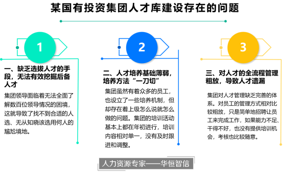 华恒智信通过访谈了解到,集团对人才管理缺乏完善的体系。对员工的管理方式相对比较粗放,只是简单地招聘让员工来完成工作,如果能力不足、干得不好,也没有提供培训机会,考核也比较随意。对人才的全流程管理体系化不足,导致了一些问题:当员工离职时,才意识到人才流失,需要人才的时候就去下面临时找、临时培训,上级检查后才发现没有合理的考核等。此外还有一些实力不错的员工因为没有及时发现,出现人才遗漏、人才流失的情况。