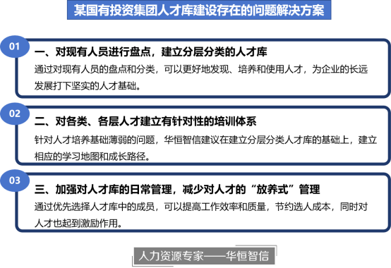 针对该集团缺少选拔人才的抓手的问题,华恒智信建议对现有人员进行盘点,建立分层分类的人才库,以提升企业的人才管理水平。