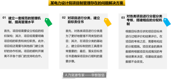 在本项目中,该单位在转型之际,遇到很多管理上的问题,其中最棘手的是项目管理不规范,体系化不足,比如,项目以“人治”为主,随机性较大;缺少前期的目标约定,导致后期的奖励和惩罚缺少依据;项目结束后没有相应的考核,导致大家干多干少一个样,打击了骨干人才的积极性。针对这些问题,华恒智信建议,需要明确相应的职责和组织架构、建立协作机制等搭建一套规范的项目组管理机制;建立目标责任书,为后续的激励或惩罚提供依据;根据项目类型的不同,设置不同的考核方法,并在考核之后要有相应的分配。