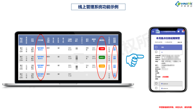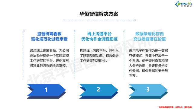 针对这些问题,华恒智信项目组助力该公司通过线上系统重塑管理流程,实现绩效提升。通过线上统筹看板,为公司高层领导提供一个实时监控工作进展的平台,确保其对各项业务流程的全面掌控;构建线上沟通平台,并引入了延期预警功能,有效促进工作进展的及时性;采用电子档案作为统一数据存储模式,并集中存放于一个系统,便于即时查看和深入分析数据,并定期备份文件数据,确保数据的安全与完整。