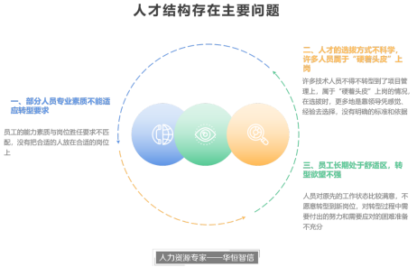 华恒智信通过调查发现,虽然该公司的招聘管理受到上级管控,长期没有招进人才,但公司目前本身的人才数量并不少,只是愿意转型到新岗位的人才比较少,特别是作为国企,在转型前,公司的大部分员工只需要做好本职工作就好,但是转型做总承包后,需要承担更多的责任与更大的风险,很多人员,特别是技术人员对原先的工作状态比较满意,不愿意转型到新岗位,对转型过程中需要付出的努力和需要应对的困难准备不充分,认为做好自己的本职工作就可以了,公司的转型和自己没什么关系,而且对个人转型后能否适应新角色、适应新环境表现出担忧和不确定,害怕自己如果转型后不胜任,还不如保持现状比较安全。
