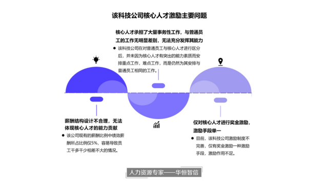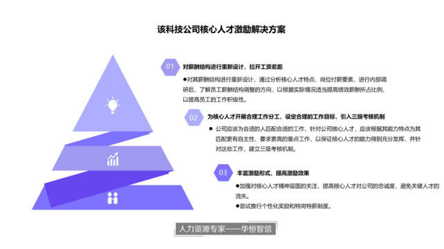 针对该科技公司现有的薪酬结构不合理,绩效薪酬所占比例太小,无法拉开不同贡献的员工的工资,造成核心人才“躺平”的情况,华恒智信的专家老师建议该科技公司对其薪酬结构进行重新设计,通过分析核心人才特点、岗位付薪要素,进行内部调研后,了解员工薪酬结构调整的方向,以根据实际情况适当提高绩效薪酬所占比例,以提高员工的工作积极性,避免核心人才产生公司工资发放不合理不公平的心理,减少人才的“不作为”和流失。