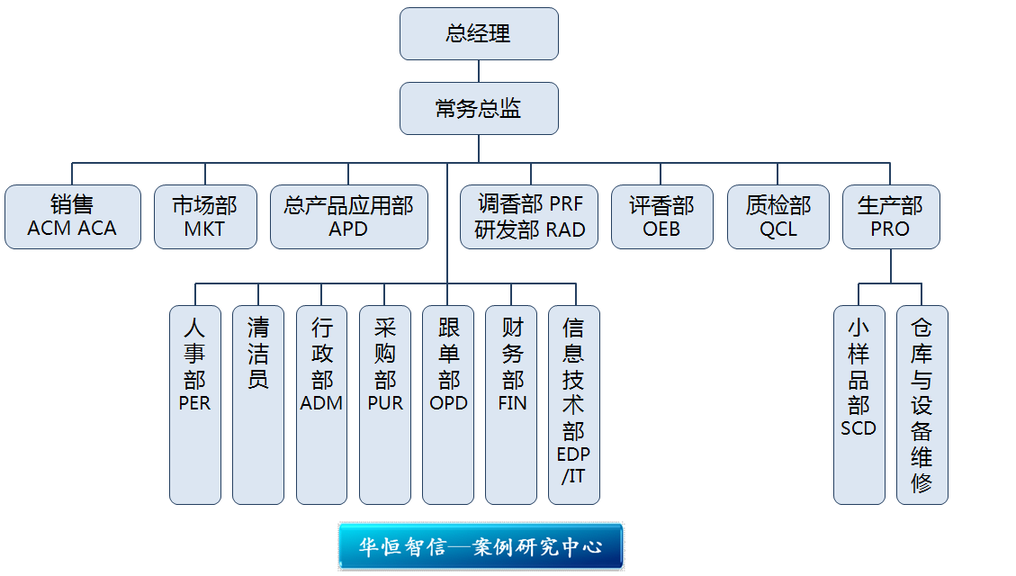 该香精香料(广州)有限公司现有的组织结构是在总经理、常务总监的领导下“前端—后端+支持职能部门”的组织结构,前端组织主要包括与前端市场接触的销售部、市场部和产品应用部,后端组织主要包括调香部/研发部、评香部、质检部和生产部,支持职能部门则包括人事部、保洁部、行政部、采购部、跟单部、财务部和信息技术部门。其组织结构图如下所示: