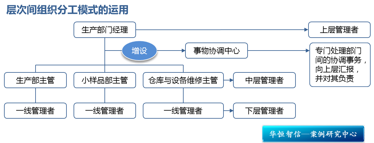 在项目咨询中,华恒智信顾问专家团队通过专业的分析和判断,剖析出了企业发展的根本问题所在,并针对问题提出了帮助企业组织合理分工和部门协调配合的改革思路:基于层次间组织分工理论,将企业各部门进行层次划分,从而解决部门之间交叉工作在管理上的空白问题;另外,增设专门的事务协调中心,缓解部门协调工作不畅的问题。