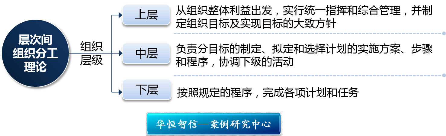 层次间组织分工是组织分工的一种,是与层次内分工相对的概念。层次间分工是在一个较大规模的组织内,将组织成员划分为不同的组织层级——上层、中层和下层,上层主要任务是从组织整体利益出发,对整个组织实行统一指挥和综合管理,并制定组织目标及实现目标的一些大致方针;中层的主要任务是负责分目标的制定、拟定和选择计划的实施方案、步骤和程序,协调下级的活动;基层的主要任务就是按照规定的程序,完成各项计划和任务。