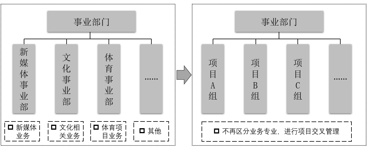 公司在原有架构下,对项目实行的是专业化管理,不同项目团队单独负责对应专业的项目。华恒智信团队了解到,采用这样的划分方式是因为公司上一阶段的业务量较大、来源相对稳定,这样的管理方式更为清晰、有条理,能够提高项目管理效率。华恒智信团队指出,不同类型的业务若存在较高的专业化壁垒,采用专业化划分能够提升公司业务开展效率,而公司现阶段业务是相互交错的关系,体育类的项目实际上也会涉及到媒体与文化专业,这样的划分方式反而阻碍了人员在不同项目之间的流转。同时公司业务转型期间,更多的是需要各部门人员进行市场开拓,解决公司的盈利问题,项目来源不稳定,这时各个部门人员多方向的开拓市场更符合公司现阶段的需求。